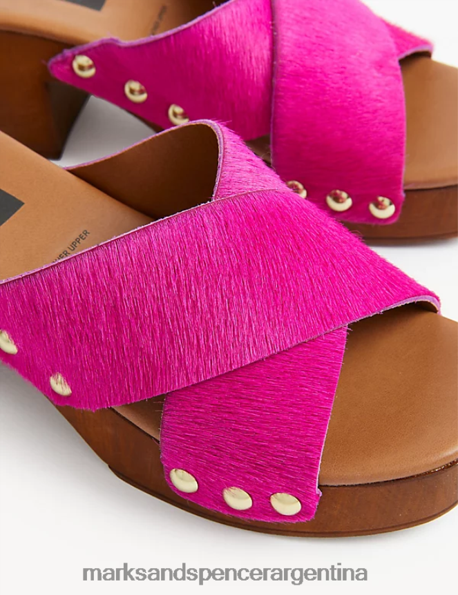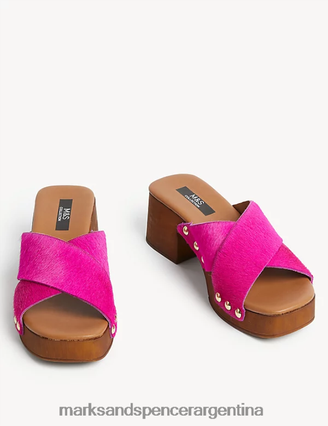 Dale un toque divertido a tu conjunto con estos zuecos de cuero con pelo. El diseño de punta abierta presenta un tacón de bloque de altura media y un llamativo detalle de tachuelas en las correas cruzadas. El acolchado antibacteriano los mantiene frescos por más tiempo. Colección m&s: prendas básicas de fondo de armario fáciles de llevar que combinan estilos clásicos y contemporáneos.